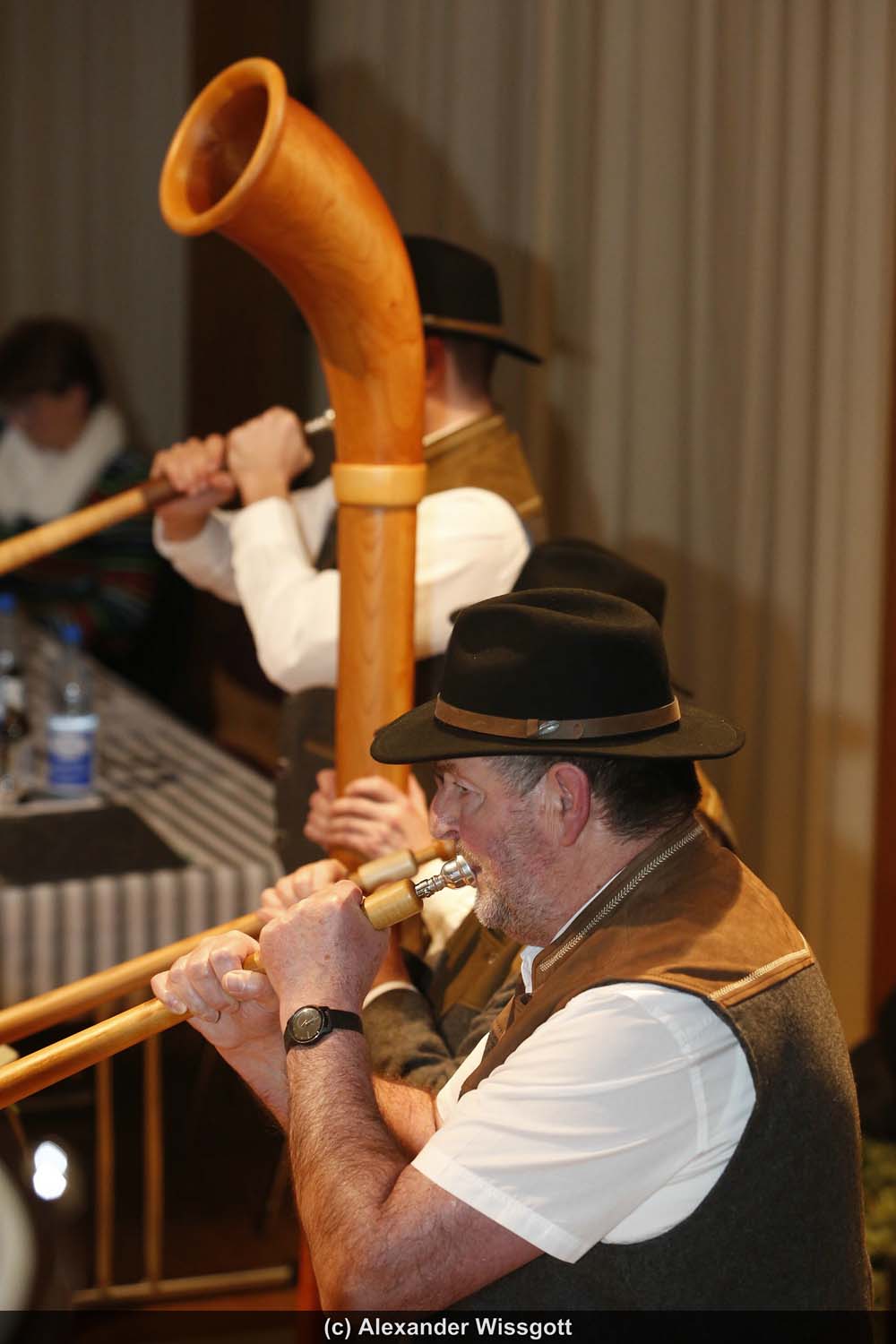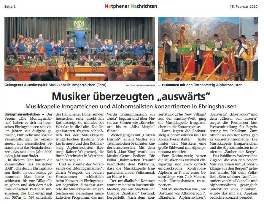 Traditionelles Konzert der "Montagsmänner" sorgt für gute LauneEHRINGSHAUSEN - Unter dem Motto "Vom Berg ins Dilltal" hatten am Sonntagnachmittag die "Montagsmänner" Ehringshausen in die Volkshalle zum Konzert eingeladen. Seit dem Jahrtausendwechsel laden die rührigen Herren zum "Neujahrskonzert" ein, das auch kulinarisch etwas Besonderes zu bieten hat. Längst hat sich die Qualität dieser Veranstaltung herum gesprochen. So war denn auch die Halle bestens gefüllt als Ulrich Wissgott das Publikum und vor allem die Mitwirkenden Willkommen hieß. Zum einen war dies die Musikkapelle Irmgarteichen aus Netphen im Siegerland unter der Leitung von Volker Ermert und zum anderen die Rothaarsteig Alphornsolisten aus Werthebach um Rainer Wagener, die für begeisterte Zuhörer sorgten. Jede Formation für sich ein hervorragender Klangkörper, zeigten sich die Bläser auch gemeinsam sehr harmonisch und ließen keine Wünsche offen. Geprägt von den engagierten Vorstellungen ihres Dirigenten, der Klassik und Romantik liebt, aber auch die traditionelle Blasmusik nicht außen vor lässt, präsentierte die Musikkapelle im 102. Jahr ihres Bestehens ein vielseitiges Programm, das mit Giuseppe Verdis Triumphmarsch aus "Aida" begann und in atemberaubender Qualität Filmmusik wie "Braveheart", "Miss Marple" und Titelmelodien von Kinder-Kultserien bot, aber auch mit "Lion King" das Musical-Genre bediente und sich mit dem "Böhmischen Traum" in der Volksmusik zu Hause zeigte. Nicht zu vergessen ein Santiano-Medley, das in den Rock von der Küste entführte, "River Boat Stomp" oder "The new Village", das aus der Welt der Fantasy kommt. Gespannt hatten die Zuhörer schon auf die Vorträge der Alphornsolisten "in F" gewartet, war hier schon rein optisch einiges zu erwarten. Allein das weltweit einzigartige Kontrabass-Alphorn mit eindrucksvollen 7,4 Metern Länge und seinen Windungen, ließ alle staunen. Was dann erklang, überbot alle Erwartungen. Auch wenn es sich um eher unbekannte Stücke wie "Am Dorfrand von Afholderbach" oder den "Staufener Alphornwalzer" handelte - die "Elke-Polka", "Bellavista" und der "Choral für Luzern" sorgten für helle Begeisterung. Für viele unvorstellbar, gab es dann zum guten Schluss auch noch gemeinsame Vorträge, wobei auch das Publikum bei "Kein schöner Land" mitwirken durfte. Der "Zauber der Berge" war ein absoluter Gänsehautmoment und die stürmisch geforderte Zugabe wurde mit "Alphornklängen aus dem Allgäu" gegeben. Dank ging abschließend an alle Helfer und Unterstützer, die den musikalischen Genuss ermöglichten. Rainer Bell, Vorsitzender der Gemeindevertretung, der mit Bürgermeister Jürgen Mock die politischen Ehrengäste anführte, sprach zu Uli Wissgott am Ausgang sicher allen aus dem Herzen: "Das war eines eurer besten Konzerte!"