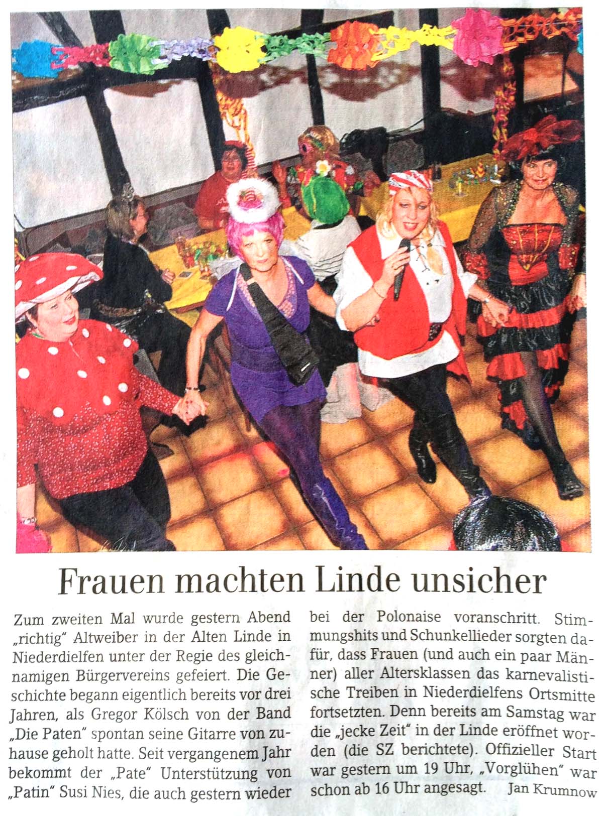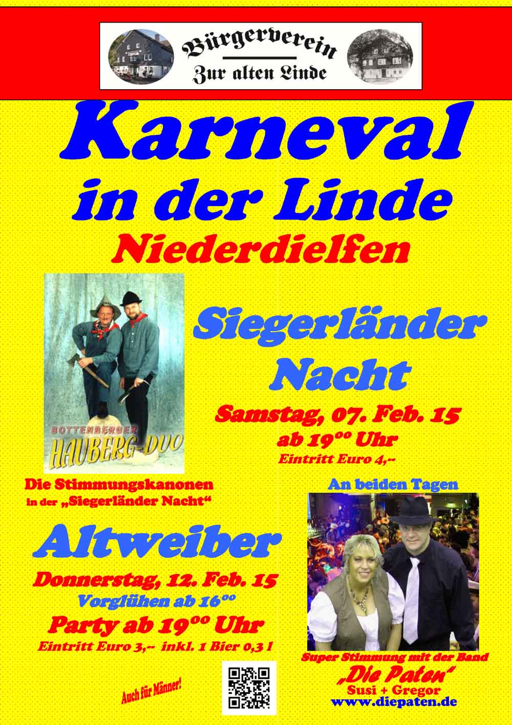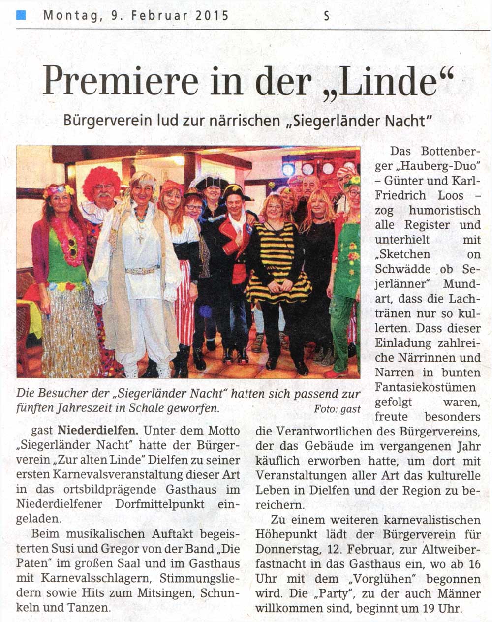 Das „Bottenberger Haubergsduo“ hatte es eindeutig auf die Lachmuskeln der Besucher abgesehen. Karl Friedrich und Günter Loos sind zwei Siegerländer Originale, die auf der Bühne zu Höchstform aufliefen. Es wurde originellste Siegerländer Comedy auf Hochdeutsch und astreinem Siegerländer Platt geboten. Zuverlässiger Garant für beste Partystimmung in der „Linde“ war bereits in den vergangen Jahren das Duo Susi und Gregor von der Partyband „Die Paten“ aus Niederdielfen. Susi hatte das Publikum in gewohnter Weise zum „Abfeiern“ animiert, Gregor war für den Sound zuständig. Mit einer Kombination aus aktuellen Stimmungshits, Oldies und etwas Rock ging in der „Linde“ voll „die Post“ ab. Auf „Altweiber“ wird mit den „Paten“ am 12. Februar weiter gefeiert, verspricht Vorsitzender „Josef van Stephoudt, der 1. Vorsitzende des Bürgervereins „Zur alten Linde“ Um 16 Uhr beginnt das „Vorglühen“, die Party startet um 19:00 Uhr. Natürlich feiern auf „Altweiber“ hauptsächlich die Damen. Die Männer sind aber auch herzlich willkommen.