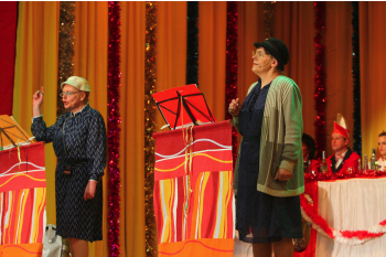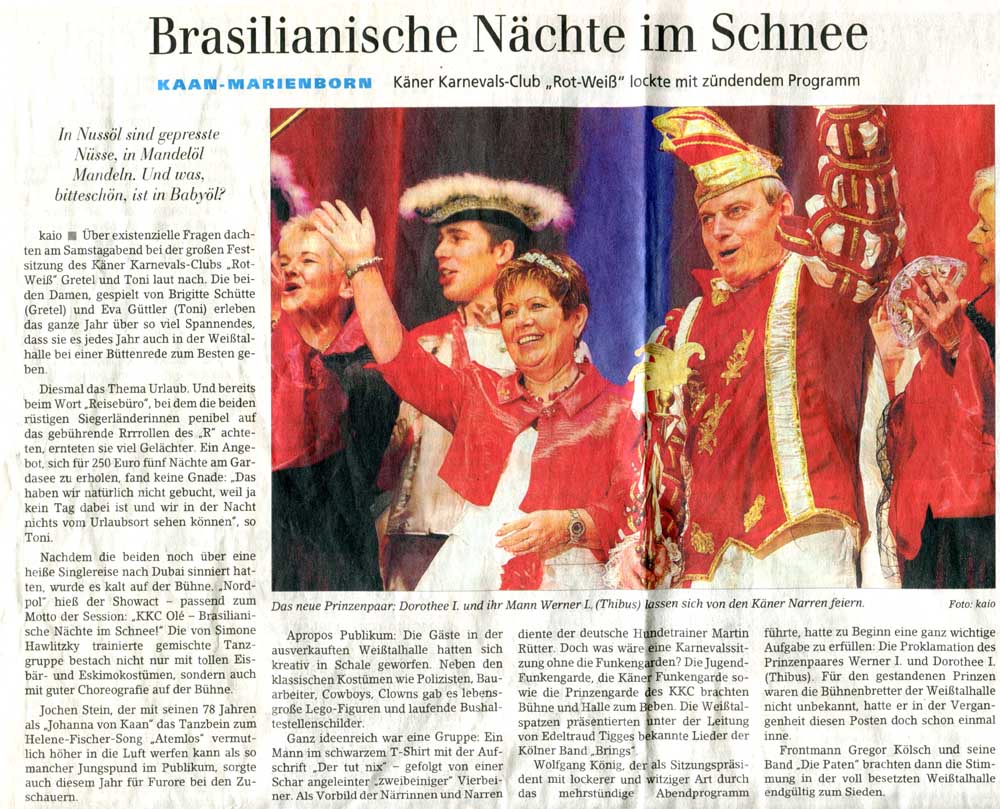 Nach dem Einzug des Prinzenpaares Michael II und Ulrike I (Kölsch) erfolgte die Proklamation diesmal singend durch das Prinzenpaar. Sitzungspräsident Wolfgang König führte gekonnt und mit viel Witz durch das Programm. Nach dem Einzug der Prinzengarde und dem Tanz der Funkengarde erfolgte der Sketch „Im Altenheim“ von Birgit und Eberhard Schmidt. Seit 44 Jahren und immer noch steht Jochen Stein mit seinen 77 Jahren als „Johanna von Kaan“ auf der Bühne und schwingt das Tanzbein tänzerisch wie in den ersten Jahren. Neben Gretel und Toni mit ihrer Büttenrede zeigte die Gemischte Tanzgruppe wie man durch den Weißtal Dschungel nach der Musik „König der Löwen“ tanzt. Auch in diesem Jahr war der Ferndorfer Karneval-Club zu Gast in der Weißtalhalle und nach dem Schlachtruf „nadda jöö“ tobte die ganze Halle.