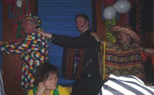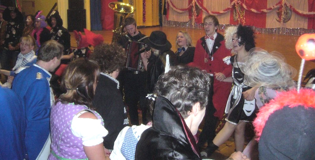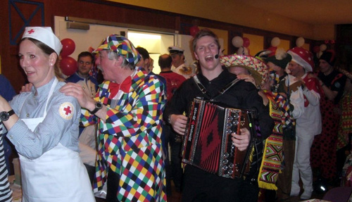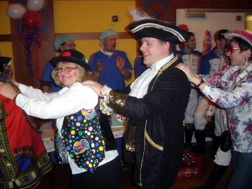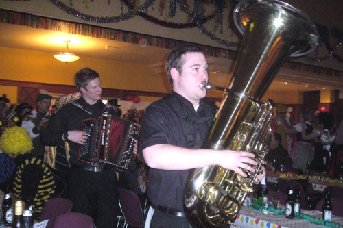 Natürlich marschierten "Die Paten" als Festkapelle beim "Großen Festeinmarsch" mit Blasinstrumenten vorweg . Neben Tanzmusik können die "Paten" ausgebildete Blasmusiker. | Michael II und Ulrike I (Kölsch) inmitten der Narrenschar, ein wunderbares Bild. | An vorderster Narrenfront "kämpfte" als Robin Hood der Siegener Bürgermeister Stefen Mues. |