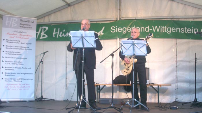Am NRW - Tag 2010 in Siegen waren wir Partner des Heimatbundes Siegerland-Wittgenstein. Das Bühnenprogramm am Pfarrer-Ochse-Platz (hinter der Marienkirche) wurde durch den Heimatbund Siegerland-Wittgenstein e.V. gestaltet. Die Vielfalt des Programmes erstreckt sich von heimischer Mundart und regionalem Liedgut über Brauchtum und Volkskundliches in allen Variationen. Am Samstag und am Sonntag machten wir jeweils 1 Stunde Bühnenprogramm. Es herrschte eine tolle Stimmung an der Heimatbühne. Wir kamen beim Publikum sehr gut an. Die Zusammenarbeit mit dem Heimatbund wird sicherlich fortgesetzt . |